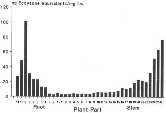 Distribution of phytoecdysteroids in spinach: 1 cm sections of the roots and stems were extracted, and ecdysteroids were measured by RIA (taken from [33]—permission granted).