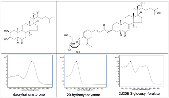 Structures of dacryhainansterone and 2-deoxy-20-hydroxyecdysone 3-glucosylferulate, together with their corresponding UV spectra and that of 20-hydroxyecdysone.