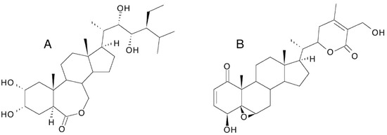 The structure of ecdysteroids is chemically related to that of brassinosteroids (plant growth hormones) in that both classes are polyhydroxylated steroids; two-dimensional representations of their structures make them look more similar than they really are. This has led to the assessment of brassinosteroids as ecdysteroid agonists or antagonists [100,101], where, at best, only very weak activity is found, and the question of whether ecdysteroids might have brassinosteroid-like activity. There is no evidence for the latter, and this would be biologically very inconvenient for an ecdysteroid-containing plant because brassinosteroids are present and active at very low concentration (nM), while ecdysteroids would be present in the μM—mM range and would swamp the brassinosteroid receptors if there was even a low cross-reactivity. If one closely considers the 3D structure of ecdysteroids and brassinosteroids (Figure 9), one sees that the distribution and orientation of the hydroxyl groups are different; the A/B-ring junction is cis in ecdysteroids and trans in brassinosteroids, resulting in a major difference in the 3D-shape of the molecules. Thus, natural members of the two classes of molecules can be expected to possess very different biochemical properties and biological activities.