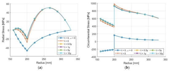 Evolution of (a) radial and (b) circumferential stresses at different times of operation (0–10 years) of a flywheel rotor with an aluminum hub and carbon FRP composite rim due to viscoelastic stress relaxation [16].