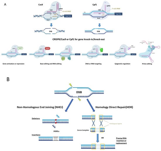(A) Principal CRISPR/Cas9 or Cpf1 types of editing (top) and possible use for gene knock-in or knock-out (bottom), synthetic-guide RNA (sgRNA), double-strand break (DSB), protospacer-adjacent motif (PAM), reverse transcriptase (RT), uracil DNA glycosylase inhibitor (UGI), green fluorescent protein (GFP) and prime editing gRNA (pegRNA). (B) The two main DNA repair mechanisms and genetic mutations.
