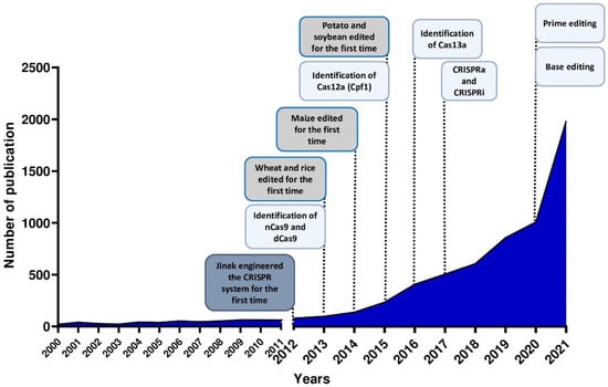 Since Jinek et al. (2012) [4] engineered for the first time the bacterial CRISPR system, it was not long before there was a demonstration of the application of CRISPR technology in plants [35,36,37], as shown by the increasing number of scientific publications that have been published during the last 10 years (Figure 2).