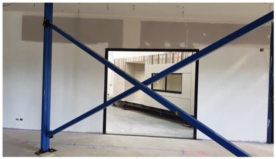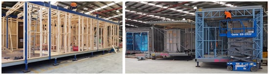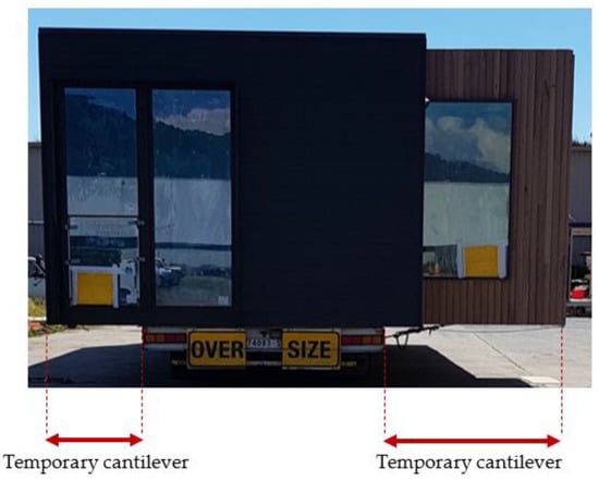 Temporary loads act on structures in any form of construction. In an in-situ construction, temporary loads are usually in the form of temporary live loads such as the weight of equipment, formwork and stored materials, in addition to the live load of construction workers. However, since on-site time is minimal in a prefab construction, temporary loads act on fully or partially finished modules or panels during their transport, lifting and handling. These loads that act on a structure during its transportation can be estimated according to the findings of some recent studies [25,26,27]. Although the stiffness of temporary bracing and the permanent structural frame should be checked against these loads, proper guidance on transportation-induced loading has not yet adequately appeared in the design standards of buildings. Much more groundwork in both research and practice needs to be carried out in achieving this. For the time being, it is prudent to overdesign the temporary bracings to encounter any unpredictable forces that the structure may undergo during all stages of its movement, since temporary bracings can be reused many times. As a result, as shown in Figure 4, temporary bracings and temporary columns are a common feature in modular construction at present.