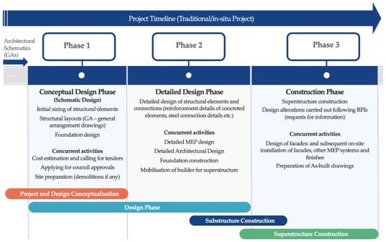 Phases in a traditional structural design process for an in-situ construction alongside other related activities that occur concurrently with each phase of the project.