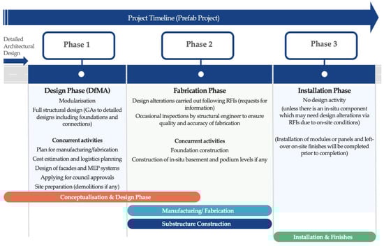 A typical DfMA (Design for Manufacturing and Assembly) process for a prefab construction alongside other related activities that occur concurrently with each phase of the DfMA process.