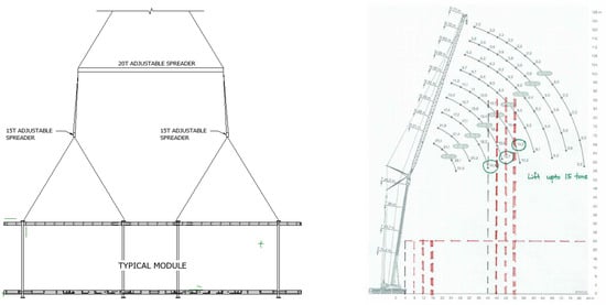 The lifting design of a prefabricated volumetric module where a top lift with an adjustable spreader is designed (left) and the lifting capacity for a mobile crane is worked out using lifting angles and distances (right).
