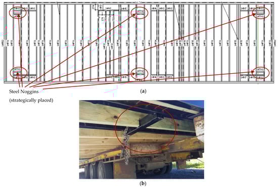 Detailing structural floor frames of volumetric modules to enable safe transportation where, (a) shows the placement of steel noggins on structural general arrangement drawings in between steel joists to provide elements to tie the module down to the trailer’s bed and (b) shows how the module is tied down to the trailer’s bed in reality.