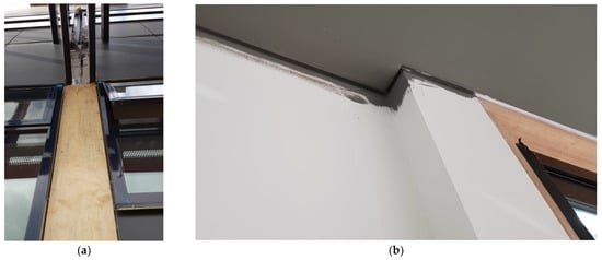 Detailing of Finishes: (a) External finishes—A module split detailed so that a certain strip of the facade can be installed on site, allowing more work to be completed offsite; (b) Internal finishes—A gap left between the plasterboards of a ceiling and a partition wall (usually covered by a cornice) to act as a movement joint during transportation.