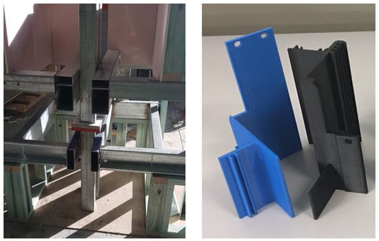 Examples of prototyping for prefabricated structures—A crude prototype with accurate full-scale dimensions of an inter-modular connection to check accessibility to the connection during installation (left) and a 3D printed rapid prototype of an extrusion frame of a façade to check buildability and fabrication issues (right).