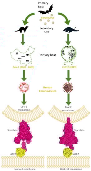 This image explains how coronaviruses spread from bats, as primary hosts, to humans, as tertiary hosts, showing complex spike–ACE2 interactions. Both originated from bats, considered natural reservoirs of SARS-like coronaviruses, CoV-1 and CoV-2 infected the human population via intermediate animal hosts in which viruses underwent an adaptation, exploiting their rapid evolution ability. In the case of CoV-1 (left side of the image), the intermediate host was identified in the masked palm-civets and, by subsequent mutations, CoV-1 became able to jump into humans (tertiary host) and led to the epidemic outbreak that emerged in China and spread in few other countries, to a lower extent, from the end of 2002 to 2003 July. For CoV-2 (right side of the image), the intermediate host is still uncertain, but was probably pangolin, from which CoV-2-related coronaviruses have been isolated. However, after the rapid evolution of these viruses in the secondary hosts, CoV-2 became able to infect the human population causing the COVID pandemic in 2019. Human coronaviruses can interact by the RBD of their trimeric spike glycoproteins, exposed on the membrane of viral envelope, with hACE2 proteins, expressed on the surface of host cells. At the bottom of the image, these interactions are visible for hACE2 and the CoV-1 spike (PDB code: 6CS2; left side, in yellow and magenta surfaces, respectively), and for hACE2 interacting with the CoV-2 spike (PDB codes: 7SBO, 7C8D; right side, in yellow and magenta surfaces, respectively).