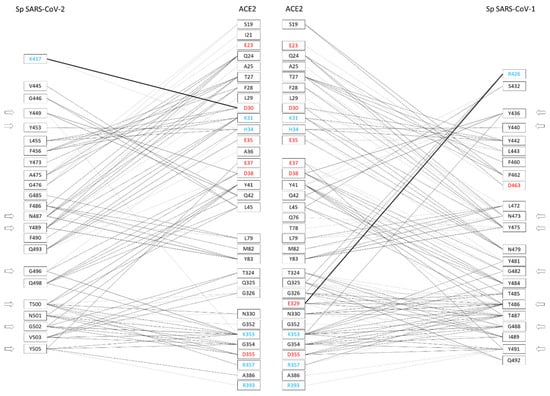 Amino acid residues of the spikes of CoV-2 and CoV-1 interacting with hACE2 at the binding interface, and vice versa (adapted from Giordano et al. 2021 [37]). The amino acids are color-coded: red = negatively charged residues; cyan = positively charged residues. The side arrows indicate the relative positions of the eight amino acid residues conserved to CoV-2 and CoV-1 spikes. The network of interactions between hACE2 and CoV-2/CoV-1 spikes (presented side-by-side) is restricted to H-bond and generic interactions (thin lines) and salt-bridges (large lines).
