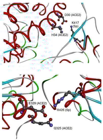 Molecular view of the peculiar interactions formed by CoV-2 K417 and CoV-1 R426 residues of the spike (adapted from Giordano et al., 2021 [37]). The upper panel shows the interaction of CoV-2 spike–K417 with ACE2-D30 and H34; both proteins are represented as backbone ribbons, with helix regions in red, beta-strand regions in cyan, and turns in green. The lower panel shows the interaction of CoV-1 spike–R426 with ACE2-Q325 and E329, with proteins drawn similarly to the upper panel.