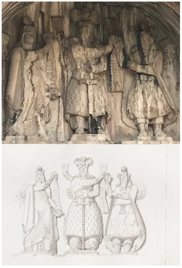The investiture scene, rock relief, end of the 6th century CE, Taq-e Bustan, The Great Grotto. Photographed by authors, the drawing is taken from: Flandin, E.; Coste, P. Voyage en Perse, Gide et J. Baudry, Paris, France, 1851.