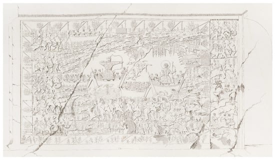 The relief is an elaborate and illustrious display of wild boar hunting on boats. The main scene is framed in such a way that it recalls a fenced hunting ground. The narrative nature of the carving is noteworthy: reading from left to right (facing the relief), the main scene depicts the king two times. The first time with a stretched bow targeting a boar, and the second time, at a smaller size with a bow in his hand and nimbate. In both scenes, the king’s garments resemble one another and are decorated with patterns of the flying creature mentioned above [] (pp. 106–108). The musicians and servants accompanying the king on the boat are clearly depicted to be smaller than their majesty. The relief is meticulous and rich in detail: elephant riders direct a herd of boars in a particular direction where the king targets them between the bushes. The presence of female musicians playing on boats, together with the illustration of fish and birds swimming freely in the water, is in sharp contrast with the turmoil of the king’s battle with animals. On the right part of the relief out of the enclosed main scene, elephant riders and ordinary people are depicted with the dead body of boars on the ground or on elephants, creating the final episode of a royal story.