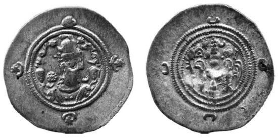 - Schindel, N. Sasanian Coinage. In The Oxford Handbook of Ancient Iran; Potts, D.T., Ed.; Oxford University Press: Oxford, UK, 2013; pp. 814–849. [Google Scholar]
