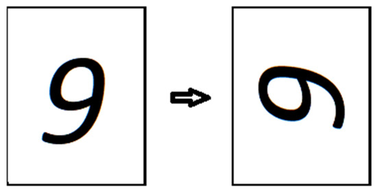 The first panel is a drawing of the digit nine (9), while the next panel is the same digit transformed by rotation [3].