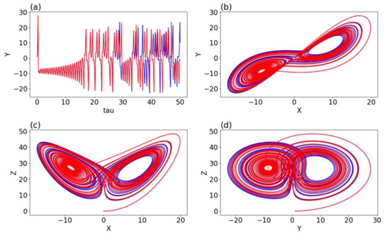The sensitive dependence on initial conditions (a) and diverged trajectories (b–d) using the Lorenz 1963 model with and . Each panel displays solutions from the control (in blue) and parallel (in red) runs, respectively. The control run has an initial condition of (X, Y, Z) = (0, 1, 0), and the parallel run additionally includes a small perturbation (1 × 10−10) in the initial value of Y. Chaotic solutions in the X-Y-Z phase space within the Lorenz model can be found in Figure 2 of [16].