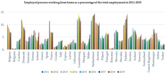 From 2011 to 2019, the share of employed persons working from home in the total employment has experienced a different evolution from country to country. In Belgium, the share of employed persons working from home decreased from 9.9% in 2011 to 6.6% in 2018. In Figure 1, a similar evolution is observed in Denmark, where the share of employed persons working from home decreased from 12.0% (2011) to 7.9% (2019). At the opposite pole are Malta and Finland, where the share of employees working at home increased by 4.2 and, respectively, 3.6 in the same period [28].