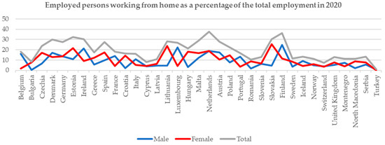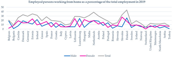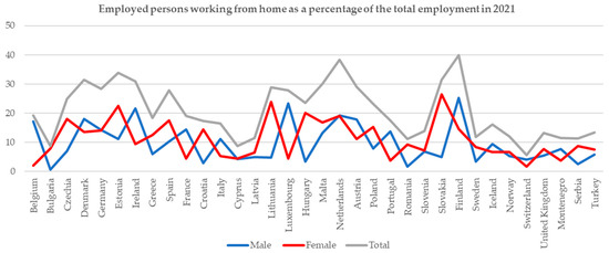 In the European Union (EU), the share of people aged between 15 and 64 working from home out of the total employment increased from 5.4% in 2019 to 12.0% in 2020 and 13.2% in 2021 [28]. The highest shares of females working from home were recorded in Finland (13.3%), the Netherlands (12.5%), and Luxembourg (12.4%). A special situation is observed in the Netherlands (15.4%) and Finland (14.7%), where the share of males who worked from home during the pandemic was higher than that of females (see Figure 2).