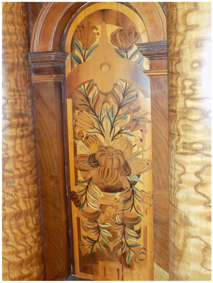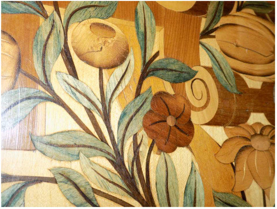 The use of blue-green wood (which falls under pigment-type spalting) became increasingly popular, and the mid-1400s through the late 1600s showed an explosion of blue-green wood in intarsiated and marquetry works. The wood was used for many applications, such as water, grass, clothing, book bindings, various types of vegetation, and animals such as parrots. The use of spalted wood (or collection of works that contained spalted wood) in intarsia and marquetry spread from Italy to Germany, Sweden, Spain, and later England (particularly Tunbridge Wells, London, UK) [1,2,3], with the skill and use of the spalted wood becoming increasingly complex. English brown oak also became a popular wood for contrasting and depth-based inlays during the Italian Renaissance, due to its uniform, rich brown color—courtesy of colonization by the brown rotting fungus Fistulina hepatica. Used to a lesser extent, but still popular, were grey stains produced by Ophiostomatoid fungi (‘blue stains’) to represent cloudy skies and occasionally water, and dark zone lines by a variety of white, rotting fungi, to give illusions of depth or to imitate marble. Blue-green wood was so popular, and microorganisms so poorly understood, that this specific type of spalting became known as ‘nature’s miracle’ [1]. It is unknown if artists at the time were able to induce spalting, or if there was merely an abundance of raw material that was harvested directly from the forest. Found bills of sale do indicate that Chlorociboria-stained wood was bought and sold, highly sought after, and valuable. Other types of spalting, which would have been easier to find and work with, were not used with any regularity. Zone-lined wood in particular, which is valuable in current markets, was not of as much interest to Renaissance woodworkers, as dye technology for stable blacks and browns was not limited, and there were plenty of wood species already in those colors to work with.