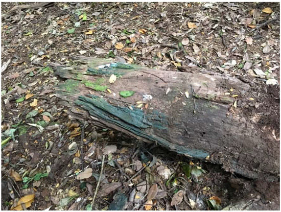 Green zone lines on decayed wood from the Peruvian Amazon. The green is so concentrated in some areas that it appears black.