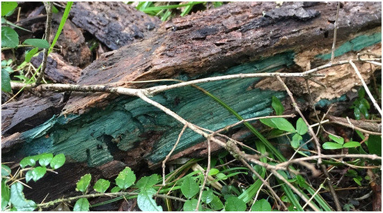 Chlorociboria-stained wood from Chiloé, Chile. Photo courtesy of Patricia Vega Gutierrez.