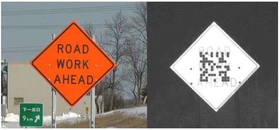 With the development of different vehicle technologies, new possibilities regarding road signs emerged, and signs began to be seen as a means of communication not only for human drivers, but also for automated vehicles. One such approach was developed and tested by the company 3M. The project presented specially designed QR codes that were installed on road signs and used a vehicle equipped with an IR light source and a camera that can read the QR code at a distance similar to the one at which a human driver can read a traditional road sign (Figure 3). The size of the code was approximately 65% that of the surface area of the sign and its design was optimized to enable far and near readings, and to ensure that critical information is conveyed to the vehicle even if the sign is partially obscured [14]. Other researchers proposed the use of RFID or radar technology for different purposes, such as warning drivers about weather conditions and hazardous road conditions ahead, additional information for advanced driver assistance systems (ADAS), and updating road sign inventories and the optimization of maintenance activities [15,16,17,18,19,20].