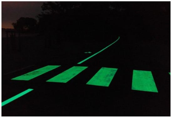 Regarding road markings, there are some proposals that involve using road paint that glows in the dark [21,22], like shown in Figure 4. The paint uses strontium aluminate pigments to create the glowing effect through the night (8–10 h); however, the strength of the glow is not constant during that period. A potential benefit of using this kind of paint is saving electricity (no need for an external light source at night) [23]. However, some further research is needed to evaluate the use and effects of such a material, e.g., its durability, possible light pollution, performance under different weather conditions, influence on road users’ behavior, etc.
