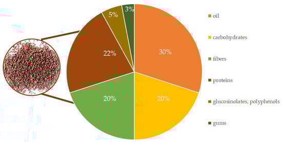 The seeds of E. sativa are characterized by oil (30–40%), a significant amount of total carbohydrates (20–25%), crude fibres (20%), and crude protein (20–30%) [5,24,25]. To date the protein fraction has been studied less than the others, however it can have important applications in agriculture as an ingredient for organic fertilizers or as animal feed [26,27]. Moreover, one recent publication brings evidence in E. sativa seeds of a napin, a protein of about 16 kDa that inhibits Fusarium graminearum growth and also shows promising antitumor properties [28]. Part of the carbohydrates and proteins forms a gum or mucilage content (2–4%) [29], and the rest of the E. sativa seeds consist of a wide range of bioactive phytochemical compounds, such as polyphenols and glucosinolates (Figure 2).