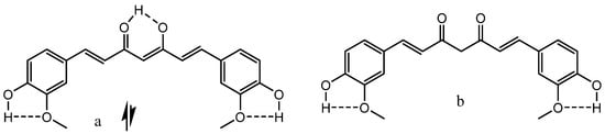 Curcumin. The second enolic tautomer is similar to acetylacetone (see Scheme 1). (a) is the enol form, (b) the diketo-form.