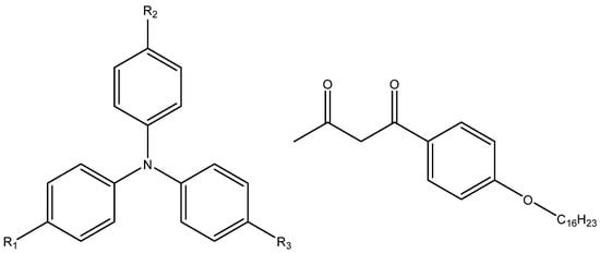 Dibenzoylmethanes (Scheme 1, R1=R3=Ph-4R and R2=H and R2=F) can be converted fully into the diketo-form by irradiation at 365 nm at RT in acetonitrile. Subsequently, the diketo-form will return to the initial 90% keto-enol form in the dark. The back reaction can be promoted by additives; water is especially effective [70]. A theoretical study of the sunscreen, Avobenzone (4-tert-butyl-4-methoxydibenzoylmethane), showed that irradiation leads both to the diketo-form, an open form (similar to that seen for β-thioxoketones in Scheme 2), and cis-trans isomerisations [71]. Other compounds, such as difuruyl and ditheonyl methanes (Scheme 1, R1 = R3 = furane or thiophene and R2 = CH3 or n-C3H7), were converted into the diketone form upon irradiation. The diketo-form returned to the keto-enol form in the dark after some days [72]. Recently, triphenylamine (TPA) with β-diketone side chains (Figure 3) was studied by ultrafast spectroscopy. Transient spectra data showed that an intramolecular charge transfer (ICT) takes place from TPA units to β-diketones units after photoexcitation [73].