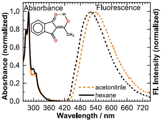 - Verma, P.K.; Steinbacher, A.; Koch, F.; Nuernberger, P.; Brixner, T. Excited–state Intramolecular proton transfer of 2-acetylindan-1,3-dione studied by ultrafast absorption and fluorescence spectroscopy. Struct. Dyn. 2016, 3, 023606. [Google Scholar] [CrossRef] [PubMed]