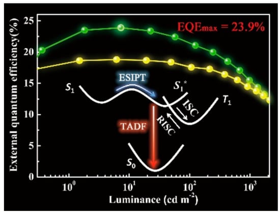 Efficiency scheme. TADF (thermally activated delayed fluorescence, ISC, intersection crossing). Yellow data are for PXZDO. Taken from Ref. [77] with permission from the American Chemical Society.