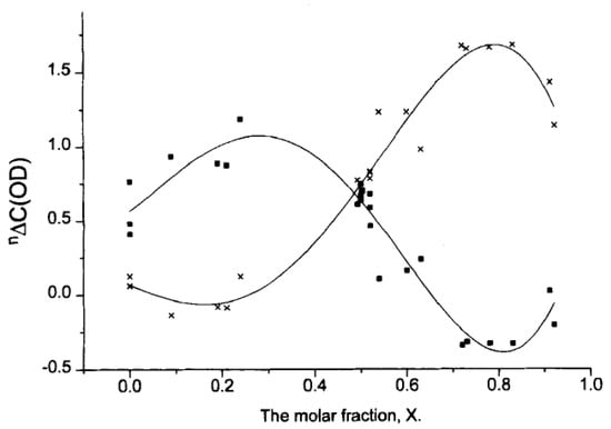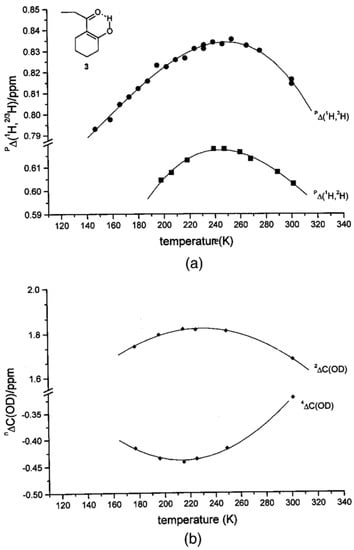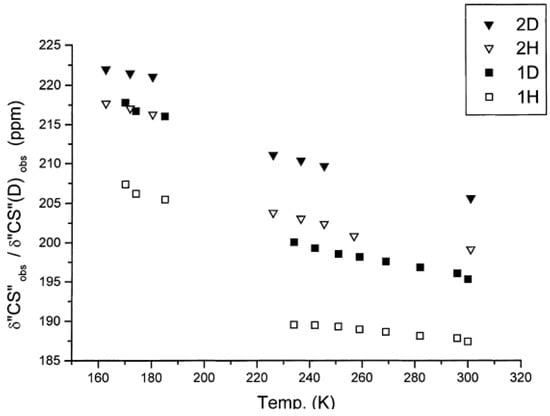 For the monothioacetylacetone (1), an open form is indicated by the fact that a plot of XH(OH,SH) chemical shifts vs. temperature showed a broadening at 200 K. For 1 and 2, a plot of deuterium isotope effects (XH partially deuteriated) vs. temperature (Figure 9) showed a large drop around, again indicating the presence of the open form.