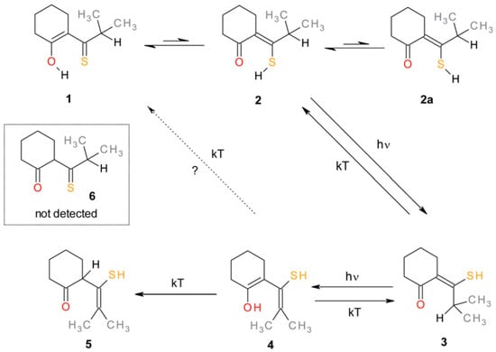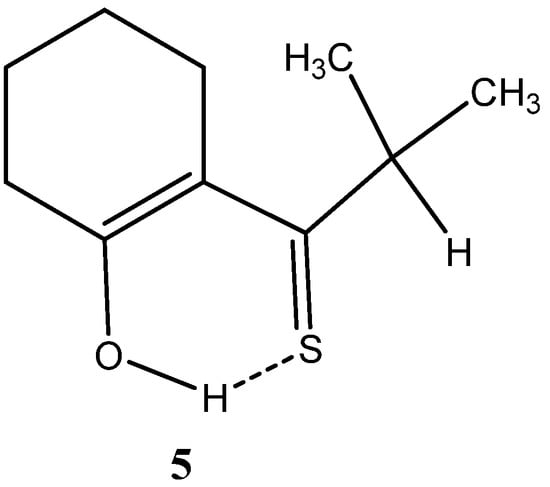 For 3 and 4, this is not the case (not shown). The cyclic β-thioxoketone 5 (Figure 10) showed no discontinuity in the XH spectrum vs. temperature [83]. Thus, 4 and 5 are suitable for photochemical conversion studies; 5 has the advantage that the oxygen is part of the ring, eliminating the possibility that the oxygen can be “trans”, as seen for 4.