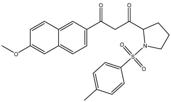 A very peculiar case is the study of 1-(6-methoxy-2-naphthalene-2-yl)-3-(tosylpyrrolidine-)2-yl) propane-1,3-dione (Figure 13), in which the structure all of a sudden is a trans-form (Figure 14) [90].