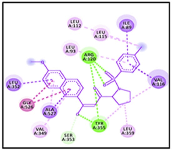 Structure of 1-(6-methoxy-2-naphthalene-2-yl)-3-(tosylpyrrolidine-)2-yl) propane-1,3-dione docked to cyclooxygenase (COX-1). Taken from Ref. [90] with permission from Elsevier.