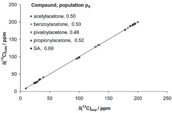 NMR. As mentioned earlier we are dealing with a slow equilibrium between diketo and keto-enol forms and a fast equilibrium between the two keto-enols forms (see Scheme 1). The former equilibrium can easily be determined from integrals of 1H NMR spectra.] [91]. Tautomeric equilibria may be determined by use of chemical shifts [92]; however, for the latter type, this requires the knowledge of chemical shifts of the individual keto-enol tautomers. A comparison between experimental 13C chemical shifts and calculated nuclear shieldings (chemical shifts) is also useful (see Figure 15) [93]. Other similar examples are shown in Ref. [94].