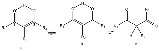 Tautomers of β-diketones. a and b are enol forms, c is the diketo-form.