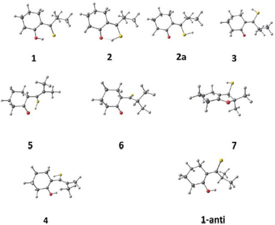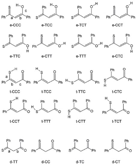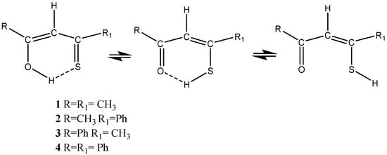 β-Thioxoketones show only “enol” forms (see Scheme 2). However, in this case, an open form is also possible (see Figure 2). A large number of tautomers, rotamers, and isomers are possible, as seen in Scheme 3.