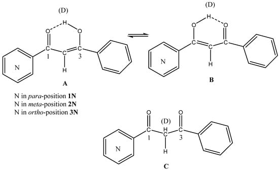- Hansen, P.E.; Borisov, E.V.; Lindon, J.C. Determination of the Tautomeric Equilibria of Pyridoyl Benzoyl β-Diketones in the Liquid and Solid State through the use of Deuterium Isotope Effects on 1H and 13C NMR Chemical Shifts and Spin Coupling Constants. Spectrochim. Acta 2015, 136, 107–112. [Google Scholar] [CrossRef]