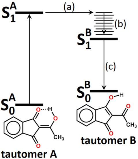 An excitation study of the enol form of 2-acetylindan-1,3-dione (AID) [75] leads to fluorescence, as seen in Figure 4. 2-acetylindan-1,3-dione is found to exist exclusively in the enol form. The first excitation at 300 nm is to S1A, which initiates ESIPT to tautomer B (Scheme 6).