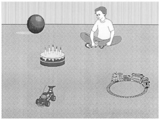 Look-and-listen studies (sometimes misleadingly called passive listening studies) do not require participants to perform any explicit task. In a popular version of this study, introduced by Altmann and Kamide (1999) [], visual stimuli consist of line drawings of semi-realistic scenes (Figure 2), while the auditory stimuli are utterances describing or commenting upon (some) pictures on the screen (e.g., The boy will eat the cake). The screen usually shows the objects mentioned in the sentences (e.g., a boy and a cake) and distractors which are never mentioned (e.g., a ball). As the interpretation of the language is co-determined by information in the visual scene, the listener’s attention is drawn to referents, including pictures that the participant anticipates will be mentioned as the input unfolds, or pictures associated with specific implied events.