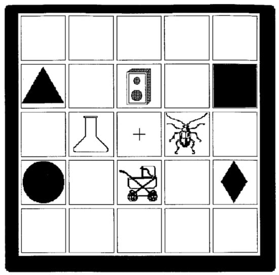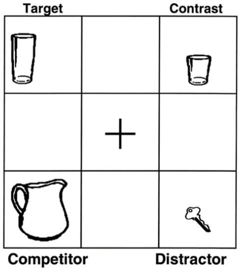 Visual world studies vary as for the complexity of the visual scene presented to participants. In the simplest case, the visual scene displays the target object and one unrelated distractor object. However, to test specific hypotheses about linguistic variables, either the linguistic stimulus or the pictures on the display can themselves be systematically manipulated, creating local or temporary ambiguities. For example, in order to investigate whether 5–7-year-old children would use their knowledge of the speaker’s visual perspective to constrain reference, Nadig and Sedivy (2002) [] created three different visual conditions, as shown in Figure 4 below.