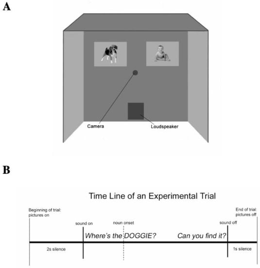 At the end of the 70s, the first experimental procedures for testing infants’ knowledge of object words were introduced. Benedict (1979) found that 12-month-old children would reliably direct to a familiar object when it was named, even when nonverbal behaviors of the speaker (including pointing and gaze) were eliminated, which often allowed toddlers to appear more linguistically capable than they really were []. A second innovative study was conducted by Thomas and colleagues (1981), who used eye movements as an index of word recognition comparing the ability of 11- and 13-month-old infants to identify a familiar named object among a series of competitors []. This initial finding was fundamental to enable the assessment of word recognition more objectively by exploiting, as a dependent measure, the time spent looking at a particular item over the other (see []). This technique allowed for the standardization of stimulus presentation, for a careful definition of what counted as a correct response, and for the elimination of nonverbal cues. In addition, for questions that focus on comprehension of verbs and events requiring motion, the advent of videotaped stimulus displays opened a new window into the exploration of language knowledge (e.g., []; see [] for a detailed review).