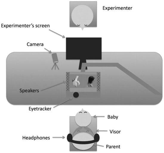 The groundwork studies of Spelke (1976) and Thomas et al. (1981) provided a starting point for later research in which preferential-looking measures were further adapted to assess early language comprehension (e.g., [,]). More specifically, the method of Golinkoff et al. (1987) [], known as the intermodal preferential-looking paradigm (IPLP), was revolutionary in that it combined use of visual and auditory stimuli simultaneously, soon becoming one of the most used experimental designs using this technique. In the procedures of these studies, infants sit on a parent’s lap in the middle of two television monitors. A concealed audio speaker midway between the two monitors plays a linguistic stimulus that matches only one of the displays shown on the screens. Mounted atop the speaker is a light that comes on during each intertrial interval to ensure that the infant makes a new choice about which screen to look at on each trial. A hidden camera records the child’s visual behavior. Researchers typically used the total looking time to the target picture and the duration of the longest look to the target picture as indexes of comprehension. With these measures, the IPLP allowed for the investigation of several different questions about burgeoning knowledge in the areas of phonology, semantics, syntax, and morphology in infants who are not yet speaking.