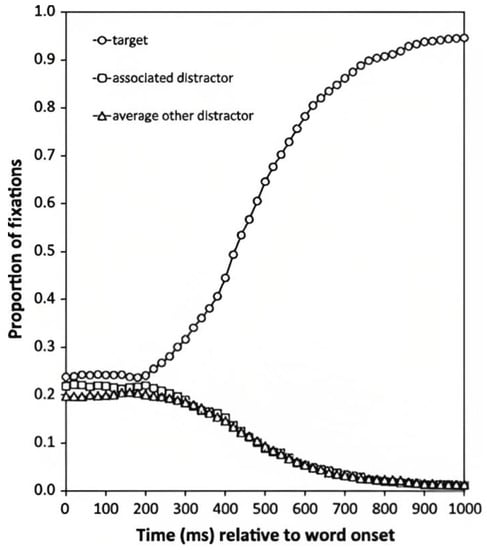 Proportion of fixations to the target, the associated distractor, and the averaged other distractors reprinted with permission from []. Copyright 2017 John Wiley and Sons. In this experiment, the participant saw a display with a target picture and three distractors and followed a simple spoken instruction to click on the target.