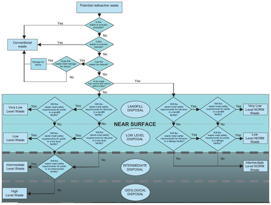Evidently, the IAEA nuclear waste classification scheme links classes of nuclear waste with associated disposal options. Moreover, the IAEA guidance document [13] provides a logic diagram for selecting a disposal route on the basis of the nuclear waste classes (Figure 1).