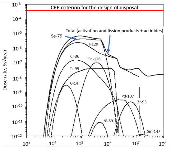 An example of expected annual doses (Sv/y) which can potentially be caused by nuclear waste radionuclides from a disposal site. The background radiation level is an order of magnitude higher compared with the ICRP recommended level of 0.3 mSv/a. Modified from [5] with permission of Elsevier.