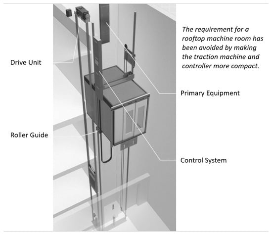 One of the most critical advancements in elevator design since the first electric elevators were released a century earlier was MRL technology. Debuted in the mid-1990s, manufacturers eliminated the need for a machine room by downsizing the motors and other apparatus to fit inside the hoistway. Consequently, MRL is an elevator system that requires less space [,,] (Figure 2). Additionally, MRL uses 30–40% less energy than comparable-sized conventional traction and hydraulic motors. MRL’s reduced power consumption also results from its lower starting current need. MRL and the regenerative drive together significantly improve energy efficiency (see next section).